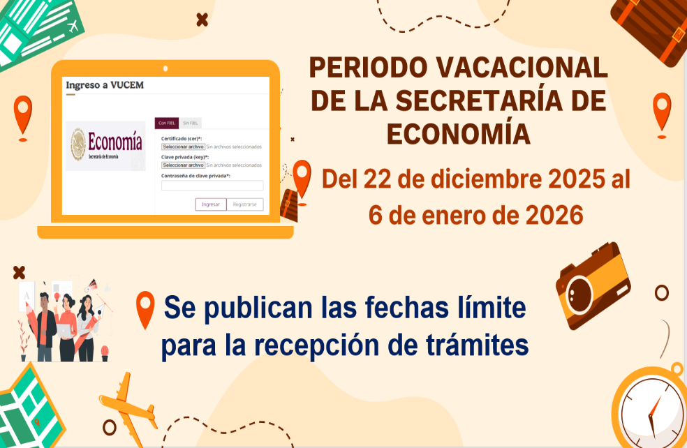 Considerando que el periodo vacacional de la Dirección General de Facilitación Comercial y Comercio Exterior (DGFCCE) comprenderá del lunes 22 de diciembre 2025 al martes 06 de enero de 2026, en el portal de SNICE se publicó el Oficio 516.2025.5545 “Aviso por el que se dan a conocer las actividades que se realizarán por parte de la DGFCCE en el periodo vacacional de la Secretaría de Economía” en donde se enlistan las actividades y fechas en que se dará atención a los trámites de comercio exterior previo al periodo vacacional y durante el mismo.