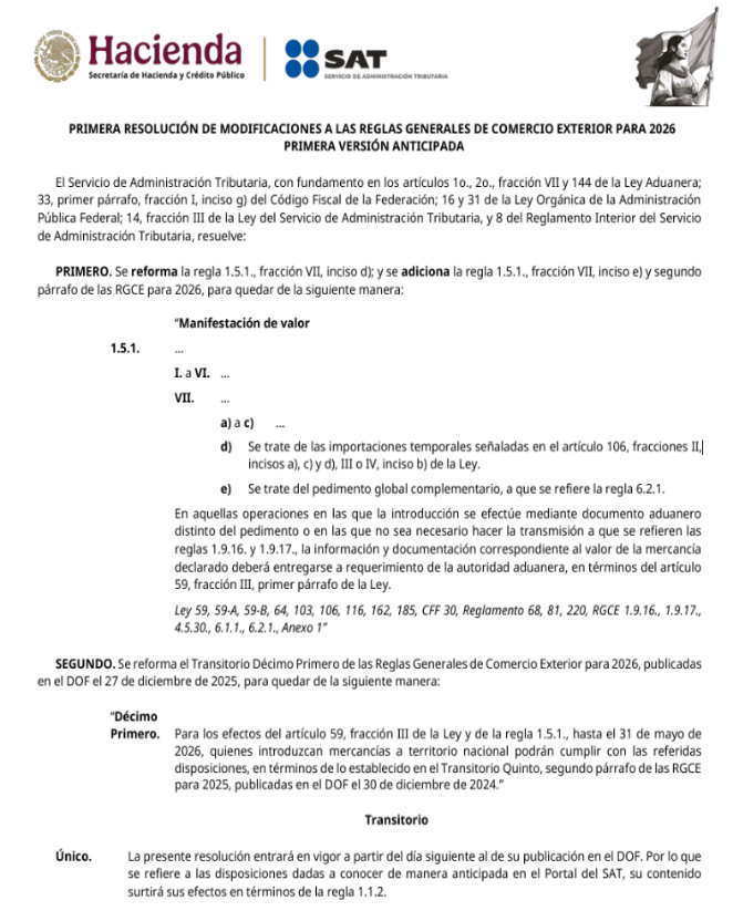 Hacemos de su conocimiento que, el 30 de marzo de 2026, el Servicio de Administración Tributaria (SAT) dio a conocer a través de su portal, la Primera Resolución de Modificaciones a las RGCE 2026 en su primera versión anticipada, cuyo contenido surtirá efectos en términos de la regla 1.1.2, es decir, que los beneficios contenidos en dichas reglas y Anexos, serán aplicables a partir de que se den a conocer en el Portal del SAT, salvo que se señale fecha expresa para tales efectos.