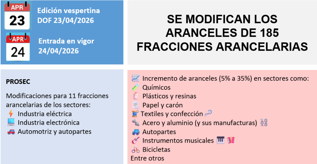 En alcance a los Boletines BES-0424.08 y BES-1224.19 mediante el cual les informamos sobre el incremento temporal de aranceles, por medio del presente hacemos de su conocimiento que el día 23 de abril del 2026 fue publicado en la edición vespertina del Diario Oficial de la Federación (DOF) el DECRETO por el que se modifica la Tarifa de la Ley de los Impuestos Generales de Importación y de Exportación, y el Decreto por el que se establecen diversos Programas de Promoción Sectorial, el cual entró en vigor el día de HOY 24 de abril de 2026.